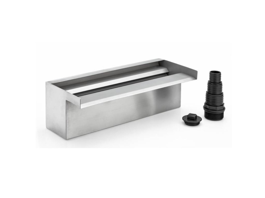 Elegantný a štíhly vodopád šírky 300 mm. Individuálne prispôsobené vodopády sú odteraz veľmi ľahko navrhovateľné, pretože robustné a vysoko kvalitné prevedenie z nehrdzavejúcej ušľachtilej ocele umožňuje buď zabudovanie do steny, alebo priskrutkovanie na stenu. Teraz s predĺženým výtokovým okrajom pre ešte jednoduchšiu montáž. Rozsah dodávky obsahuje závitové otvory, hadicové tvarovky a zátky. Zodpovedajúce čerpadlo zabezpečuje čistý a rovnomerný vodopád: 0,8 m - 1,0 m pre výšku vodopádu = AquaMax Eco 3500 - 4000 / 0,4 m - 0,6 m = AquaMax Eco 2500 / 0,2 m = AquaMax Eco 2500.